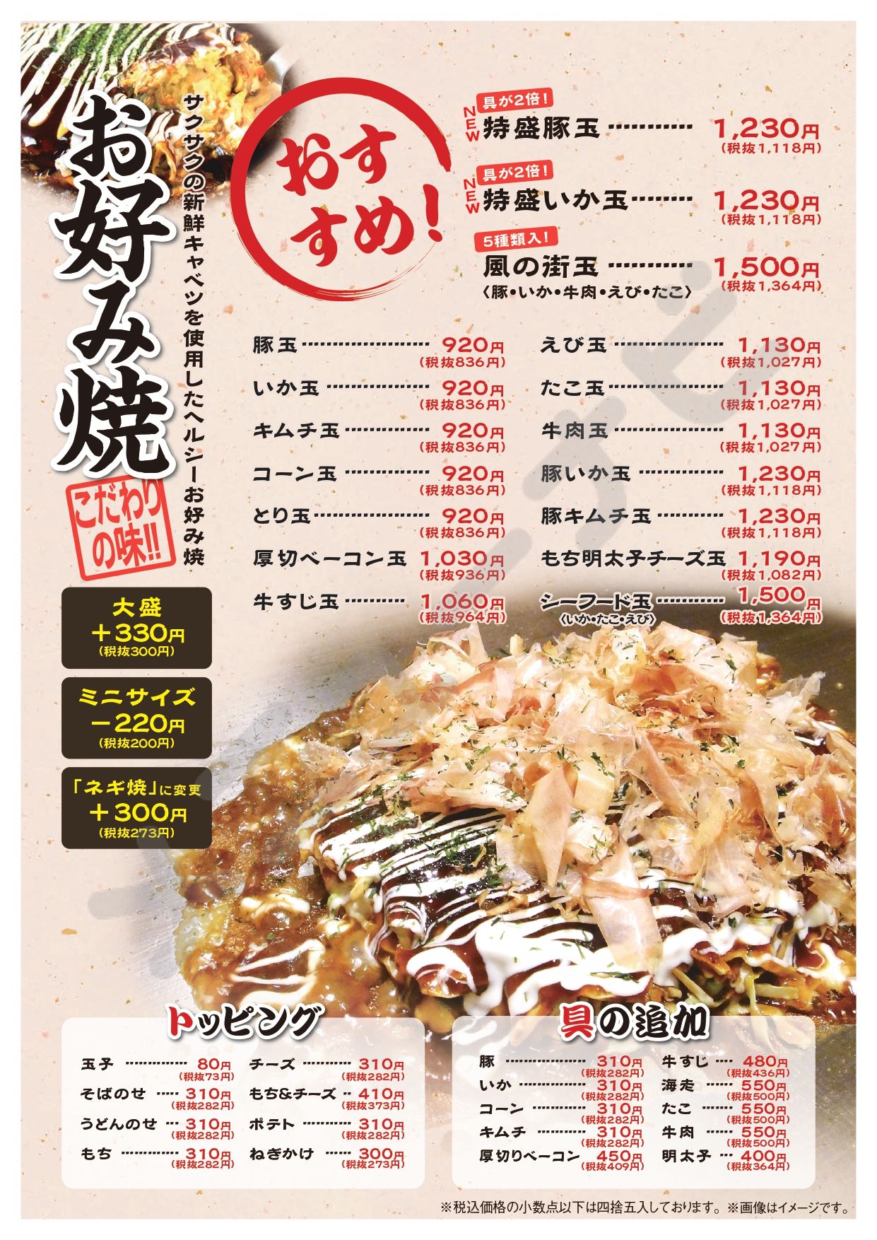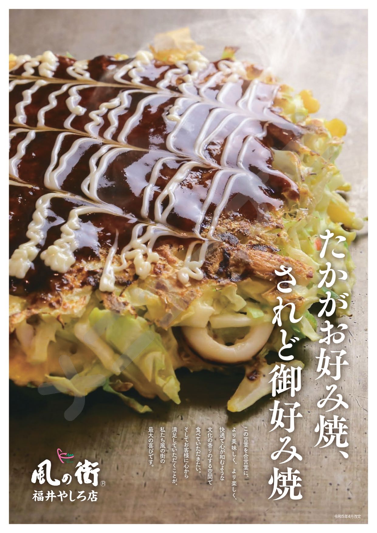 サクサクフワフワのお好み焼は、新鮮なキャベツをたっぷり使用しているのでとってもヘルシー。秘伝のソースをタップリかけてお召し上がり下さい。